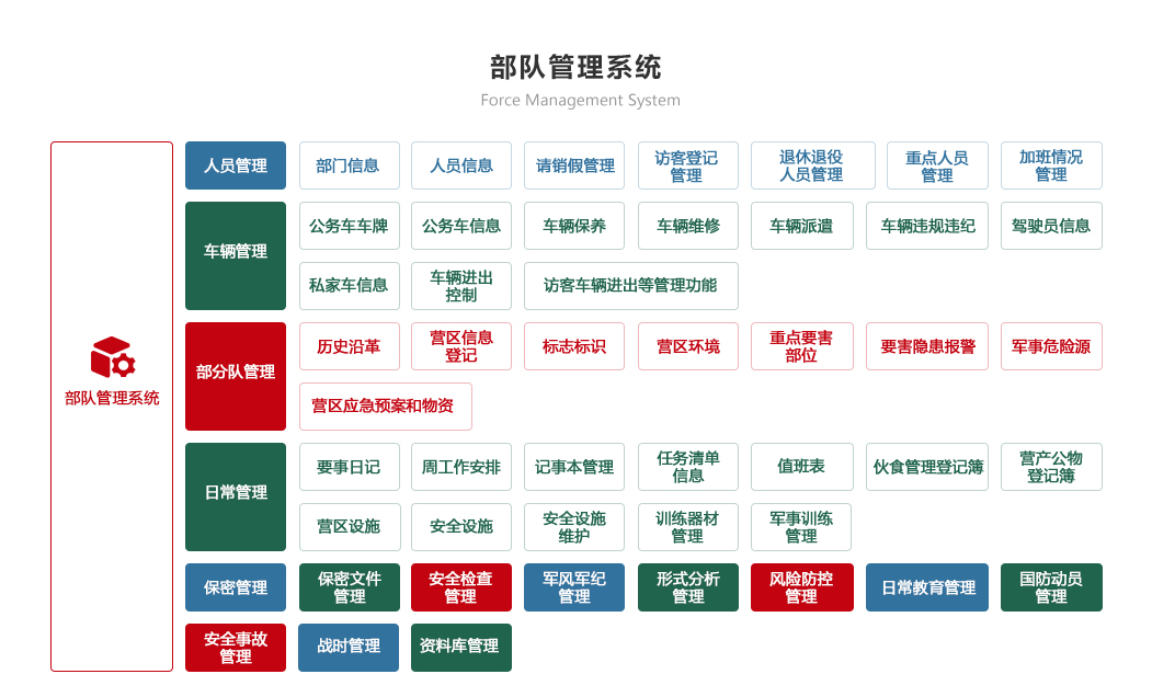 部隊管理系統 機關辦公系統 軍事教育系統 智慧政工系統 軍事訓練系統 后勤保障系統 智慧安防系統 裝備管理系統